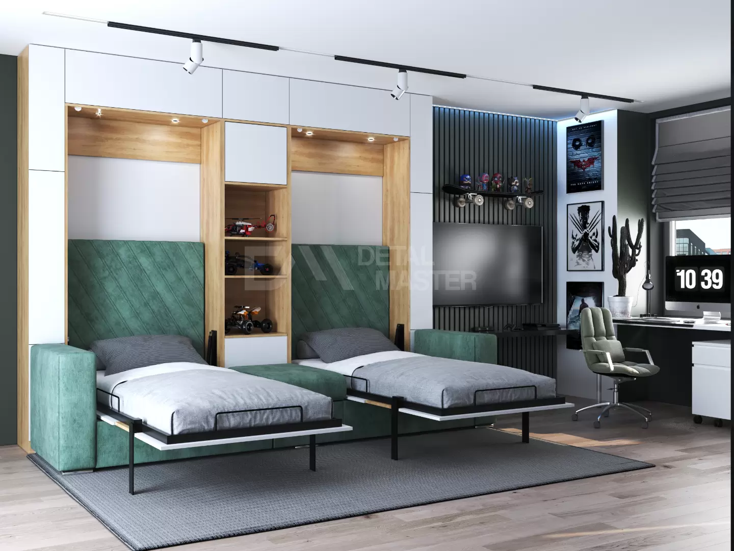 Детская шкаф-кровать с двумя спальными местами  "Twin" работает на механизме раскладывания собственной разработки "Balance". Кровать раскладывается легким движением руки, превращаясь в полноценное спальное место. Просто потяните за ножку-маятник, которая самостоятельно фиксируется в нужное положение при опускании.
