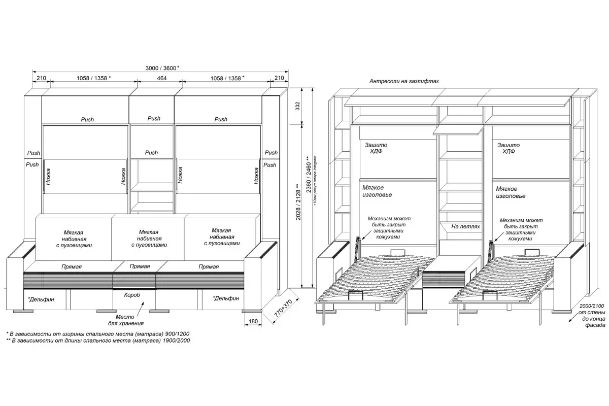 Дополнительные опции, такие как: освещение, зарядное устройство, розетки, мягкое изголовье, матрас, мягкий борт - не входят в стоимость шкаф-кровати "Twin". Вы всегда можете самостоятельно их добавить в опциях или написать менеджеру при оформлении заказа.